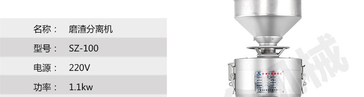 SZ-100-磨渣分離機(jī)系列,適用于把豆制品磨碎分離漿和渣;適用于豆制品廠、飲食服務(wù)業(yè)、食堂、飯店及個(gè)體商戶(hù)使用。