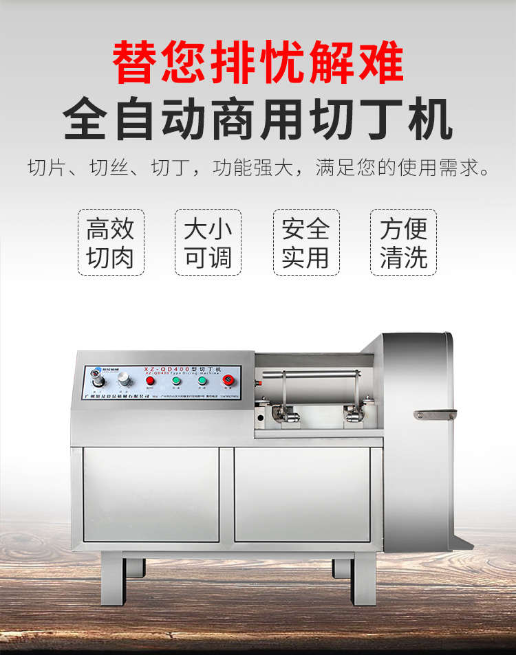 XZ-QD400切丁機,替您排憂解難全自動商用切丁機切片、切絲、切丁,功能強大,滿足您的使用需求。多功能&實用人即可操作,切出自己想要的規(guī)格,滿足商用多種需求。