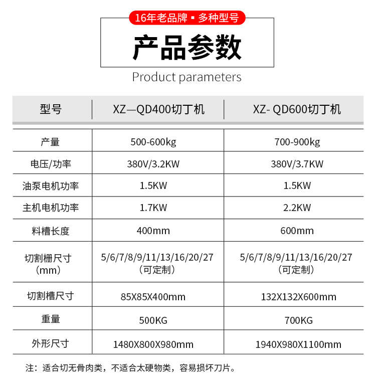 名稱XZ-QD400切丁機 電源380V 功率主:3.2KW。油泵電機功率1.5KW,主機電機功率1.7KW 產(chǎn)量500-600kg 尺寸切割槽尺寸85X85X400mm,外形尺寸1480X800X980mm 重量500KG 規(guī)格料槽長度400mm,切割柵尺寸5/6/7/8/9/11/13/16/20/27(mm)(可定制) 其他