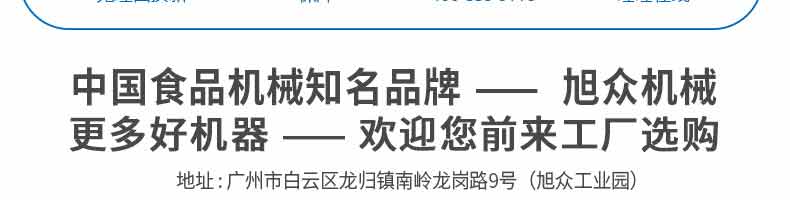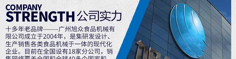 廣州旭眾食品機(jī)械有限公司是一家集科研開(kāi)發(fā),生產(chǎn)設(shè)計(jì),營(yíng)銷(xiāo)服務(wù)為一體的現(xiàn)代化生產(chǎn)企業(yè)?,F(xiàn)代化生產(chǎn)車(chē)間,精湛制造技術(shù),所產(chǎn)機(jī)械歷經(jīng)市場(chǎng)重重考驗(yàn),不斷贏得海內(nèi)外客戶的贊譽(yù)。