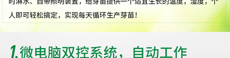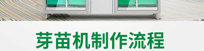 芽苗機(jī)系列,全自動芽苗機(jī):智能化一生產(chǎn)安全無公害的芽苗,智能控溫、定時淋水、自帶照明裝置,給芽苗提供一個適宜生長的溫度,濕度,個人即可輕松搞定,實現(xiàn)每天循環(huán)生產(chǎn)芽苗!