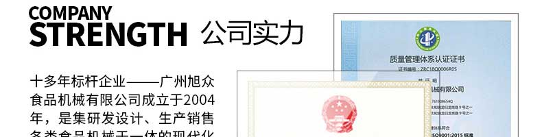 廣州旭眾食品機(jī)械有限公司是一家集科研開發(fā),生產(chǎn)設(shè)計,營銷服務(wù)為一體的現(xiàn)代化生產(chǎn)企業(yè)。現(xiàn)代化生產(chǎn)車間,精湛制造技術(shù),所產(chǎn)機(jī)械歷經(jīng)市場重重考驗,不斷贏得海內(nèi)外客戶的贊譽(yù)。