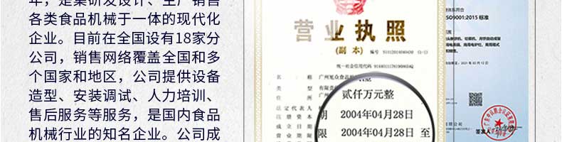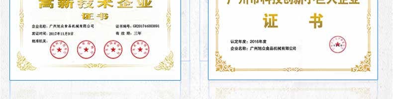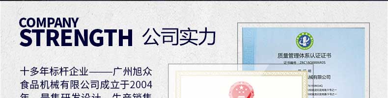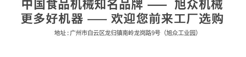 廣州旭眾食品機械有限公司是一家集科研開發(fā),生產設計,營銷服務為一體的現(xiàn)代化生產企業(yè)?,F(xiàn)代化生產車間,精湛制造技術,所產機械歷經市場重重考驗,不斷贏得海內外客戶的贊譽。